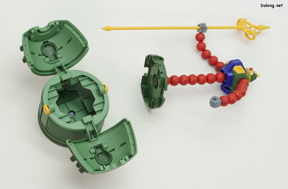 무장으로 제공되는 석장에는 2개의 빔파츠를 적용하여 다양한 형태로 활용할 수 있는데요. 프라모델 오리지널 기믹으로 8개의 미니 만다라 건담이 제공되어, 몸체 또는 석장에 장착할 수 있습니다. 또한 하체를 열고 상체를 집어넣어 방어력을 강화한 형태로도 만들 수 있는데요. 하체를 열고 상체를 분리하면 내부에 악세사리들을 수납하는, 재미있는 기능도 제공하고 있습니다.