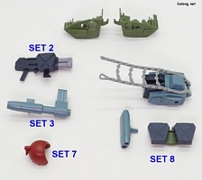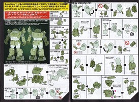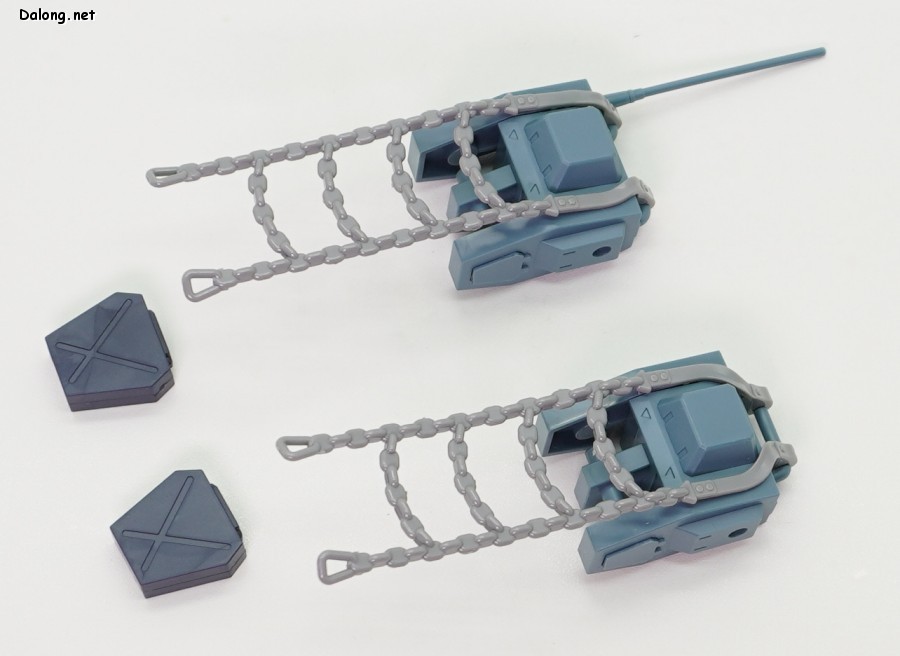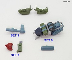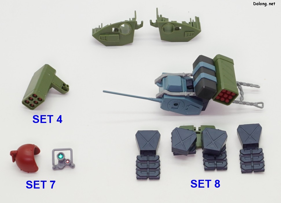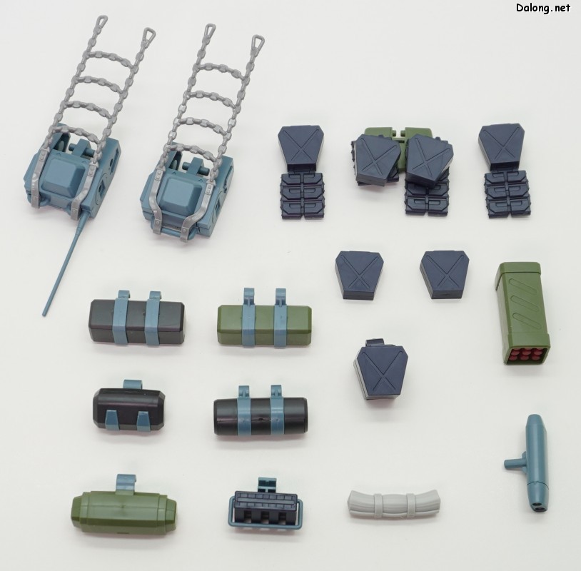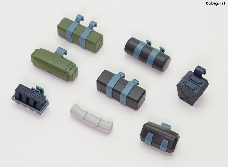 이번 확장세트의 포인트는 백팩에 있는데요. 안테나가 달린 그레고르용과 나머지 키리코/바이만/무자기에 적용하는 일반 백팩 2가지를 베이스로 하고 있습니다. 여기에 연질의 체인파츠를 걸고, 8가지 장비를 선택적으로 거치하게 되어 있는데요. 파일럿마다 전혀 다른 장비를 조합할 수 있게 되어 있습니다. 그외에 그레고르/무자기용으로 사용되는 리어스커트와 캐터필러 부착형 탄창 유닛도 제공되는데요. 신규조형의 복부 2연장 미사일은 키리코기와 무자기에 적용할 수 있습니다.