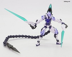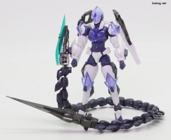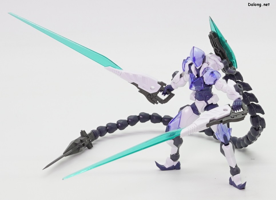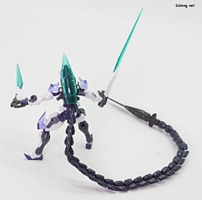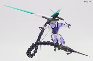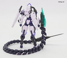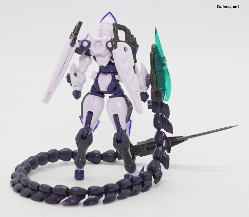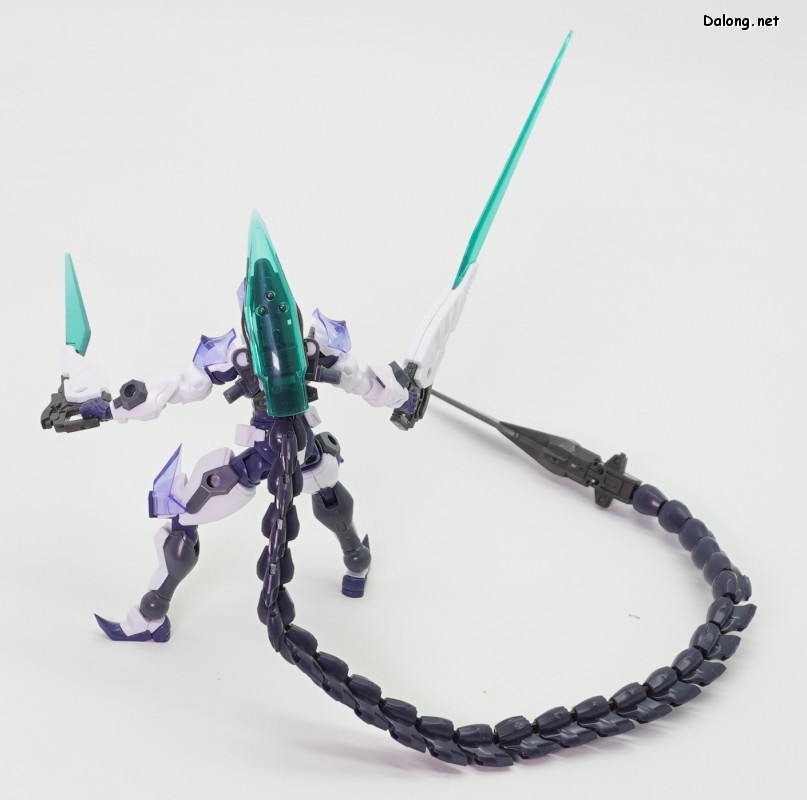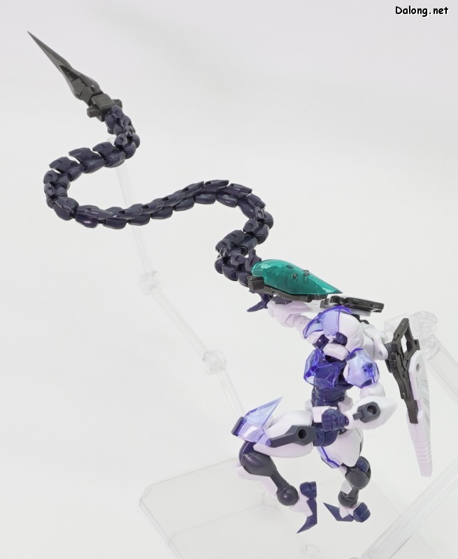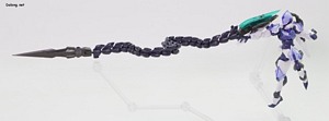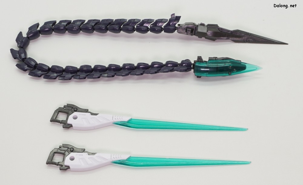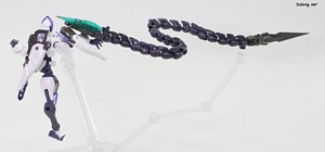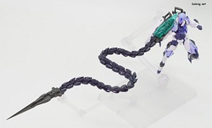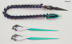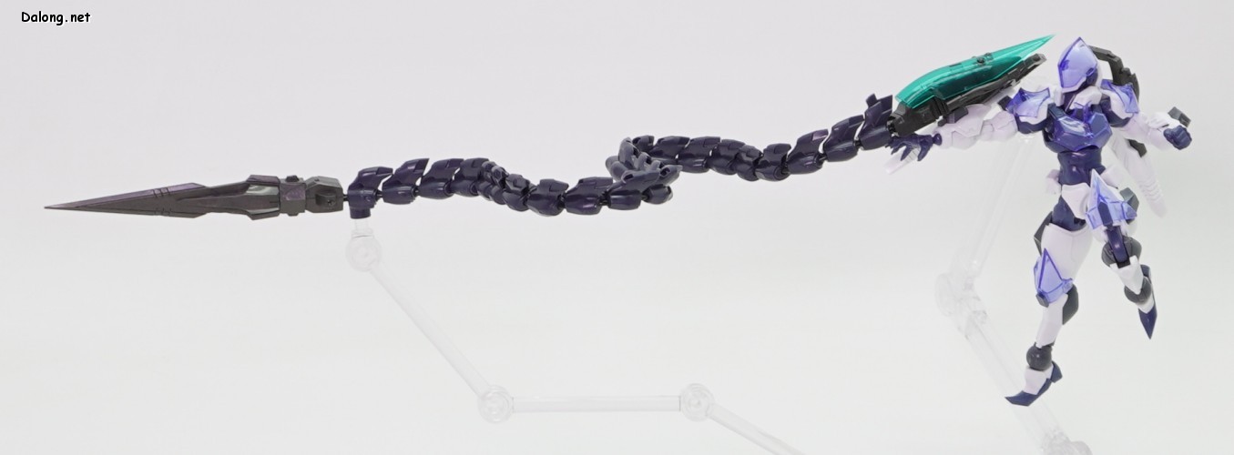 무장으로 2개의 라이플과 체인 블레이드가 제공되는데, 라이플에는 이펙트 파츠를 각각 적용할 수 있는데요. 체인 블레이드 내부에는 2가닥의 리드선이 심어저 있어서, 어떤 각도로 휘어도 잘 고정되고 있습니다. 다만 체인 블레이드가 무거워서, 이를 이용한 액션 포즈를 취할 때 무장용 스탠드가 추가로 더 필요하네요.