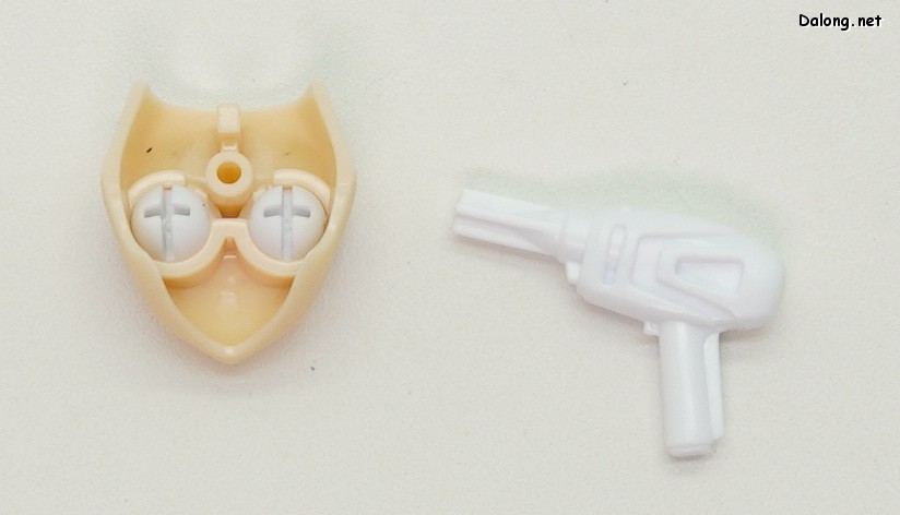 대신에 꽤 다양한 악세사리들이 제공되고 있는데요. 머리는 탄포 인쇄를 포함한 3가지 얼굴과 눈을 가린 형태의 헬멧으로 교체할 수 있으며, 몸통은 상체, 허리, 팬티 부분에 각각 다른 형태의 교체 파츠가 들어있습니다. 또한 발가락 형태의 발과 초기 메가미 디바이스 킷과 호환하기 위한 어깨 관절, 블럭 2와의 호환을 위한 머리 파츠도 동봉되어 있는데요. 등에 장착하는 무장 행거와 전기 드라이버도 악세사리로 제공되고 있으며, 전기 드라이버를 이용하면 탄포 인쇄된 눈동자의 방향도 바꿀 수 있게 되어 있습니다.