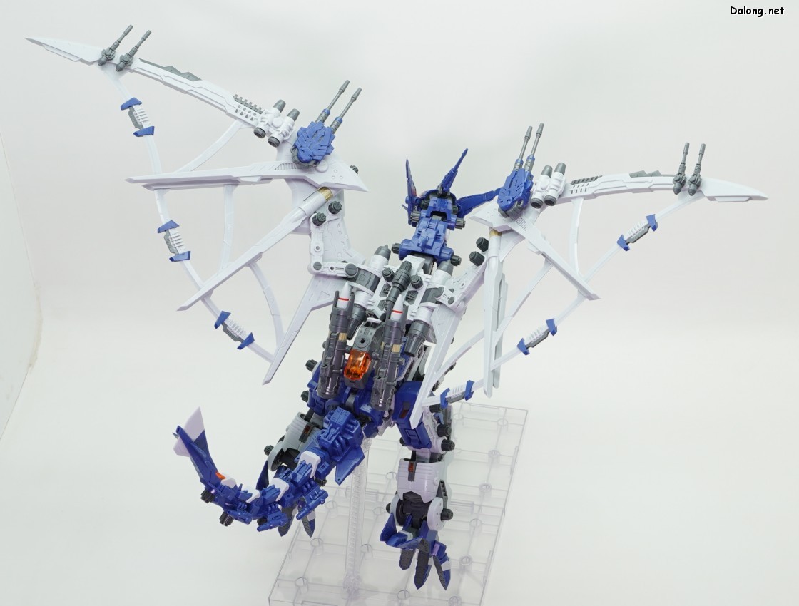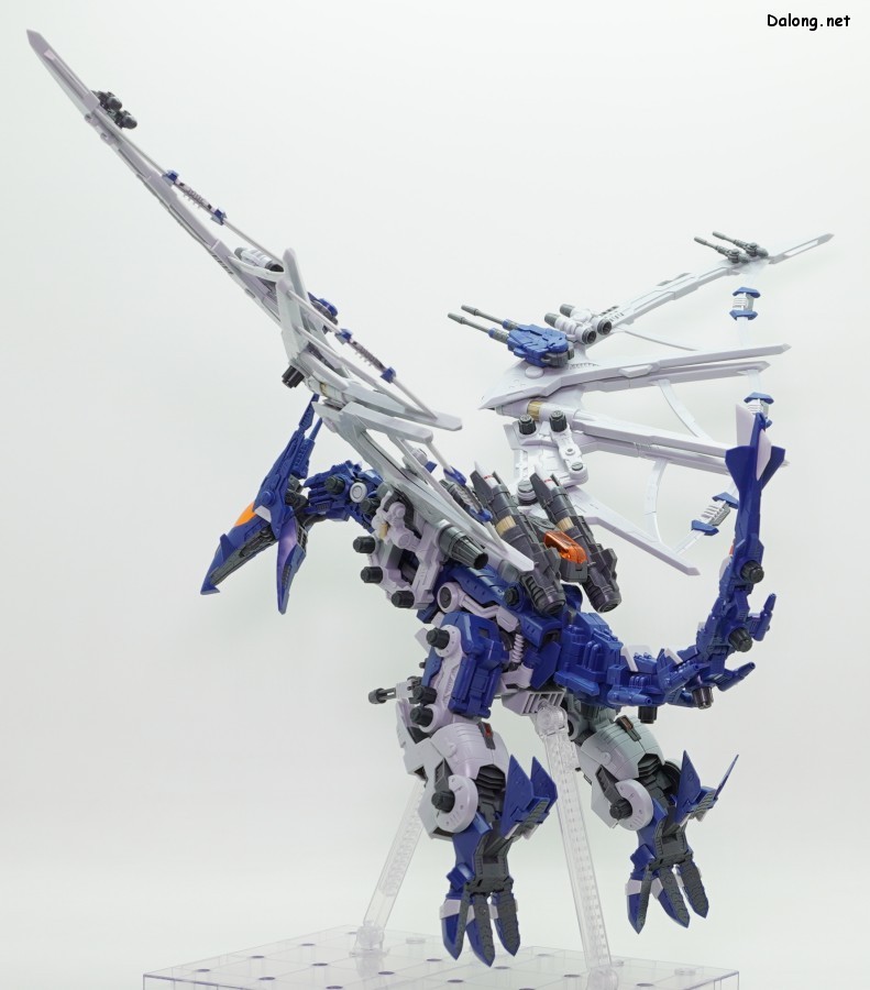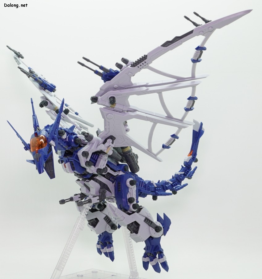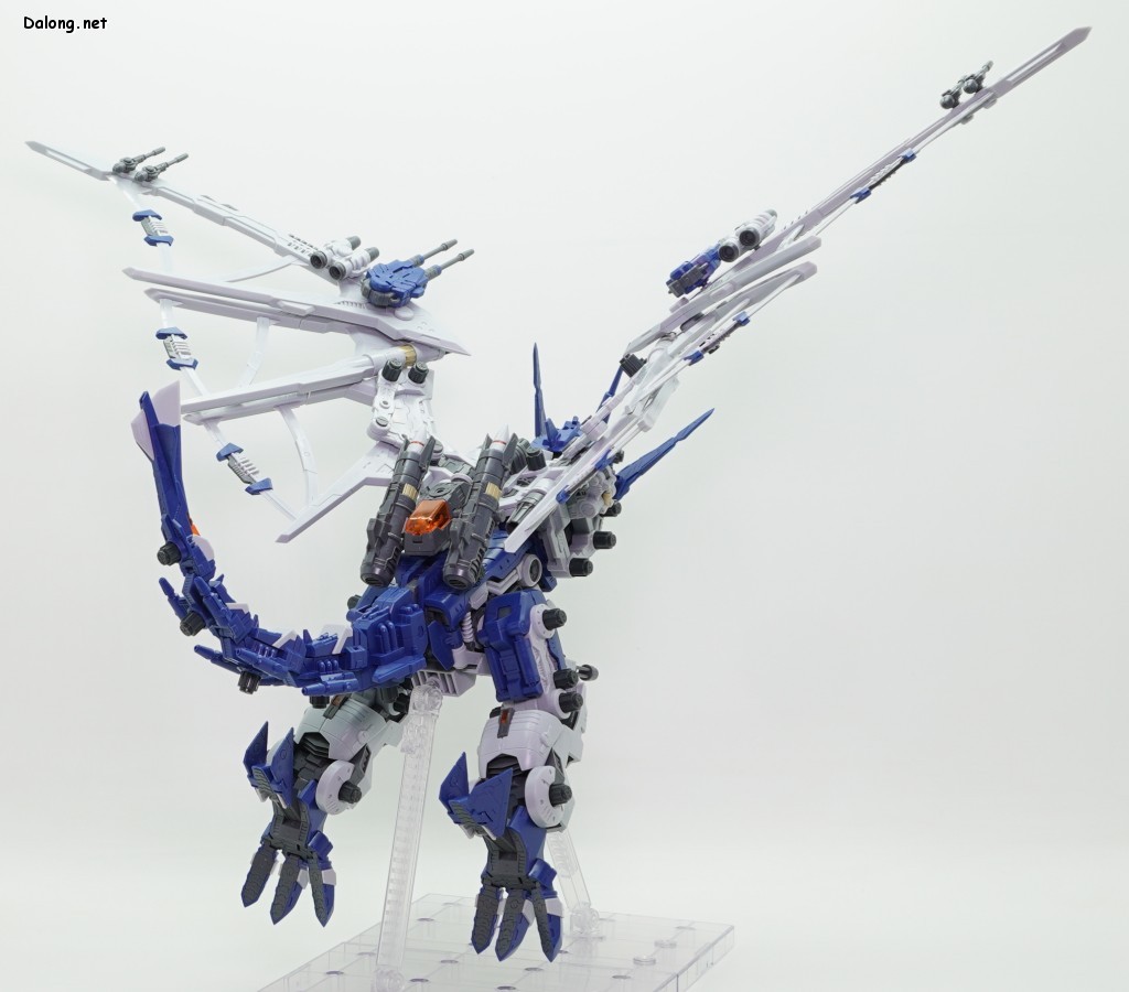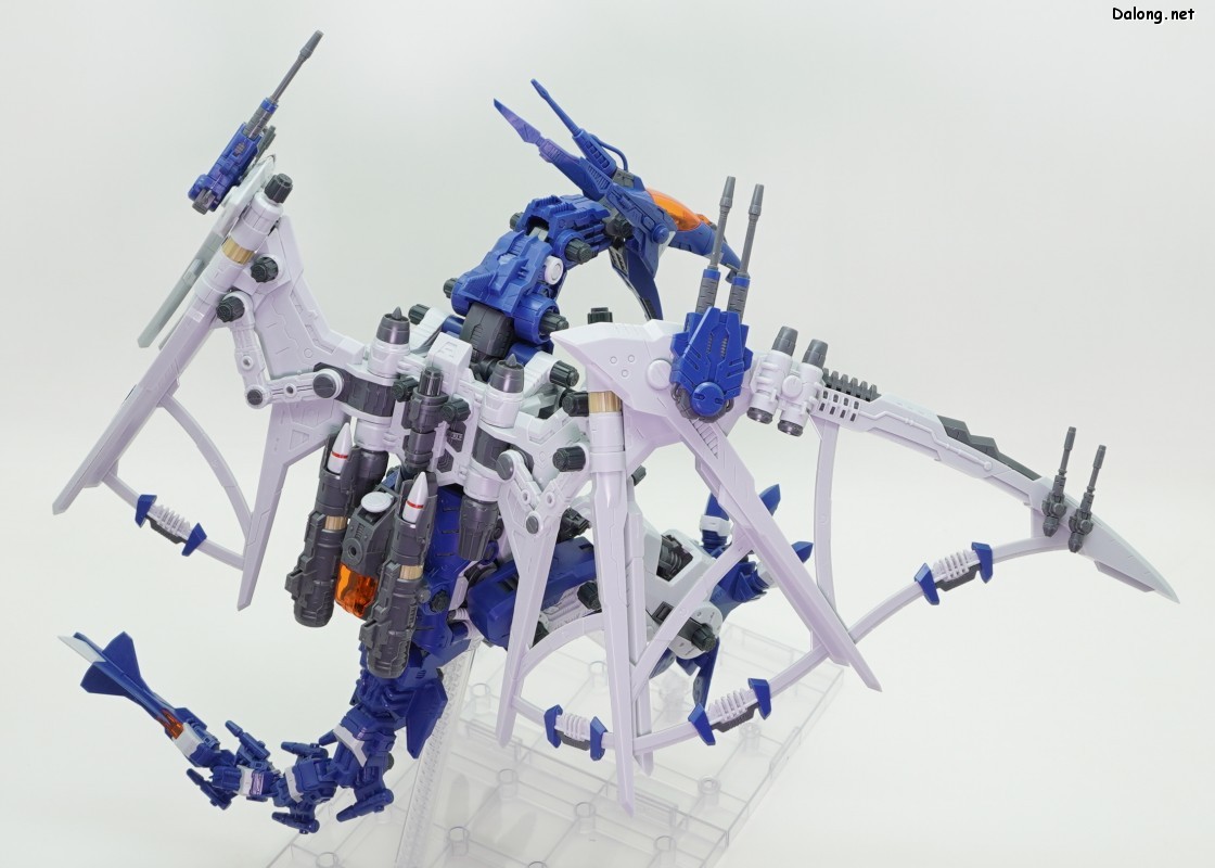 기믹적으로는 2개의 콕핏 해치 오픈 및 조이드 코어 분리가 가능한데요. 입을 벌리면 AZ 고열화염방사기를 노출시킬 수 있고, 등에 달린 2연장 전술미사일을 분리하여 별도 스탠드에 디스플레이할 수 있습니다. 스탠드에 올릴 때는 복부 커버 2개를 분리하여 스탠드용 복부 장갑으로 교체해야하는데요. 공중 디스플레이를 위해서는 별매의 플라잉 네오 베이스 2개가 필요한데, 반다이 액션베이스와는 고정핀 크기가 달라서 사용할 수 없습니다. 마지막으로 별매의 롱레인지 버스터 캐논을 장착할 수 있는 파츠 2개도 들어있긴 하네요.