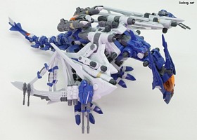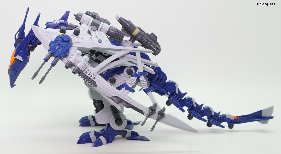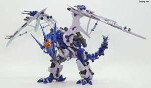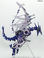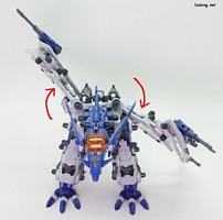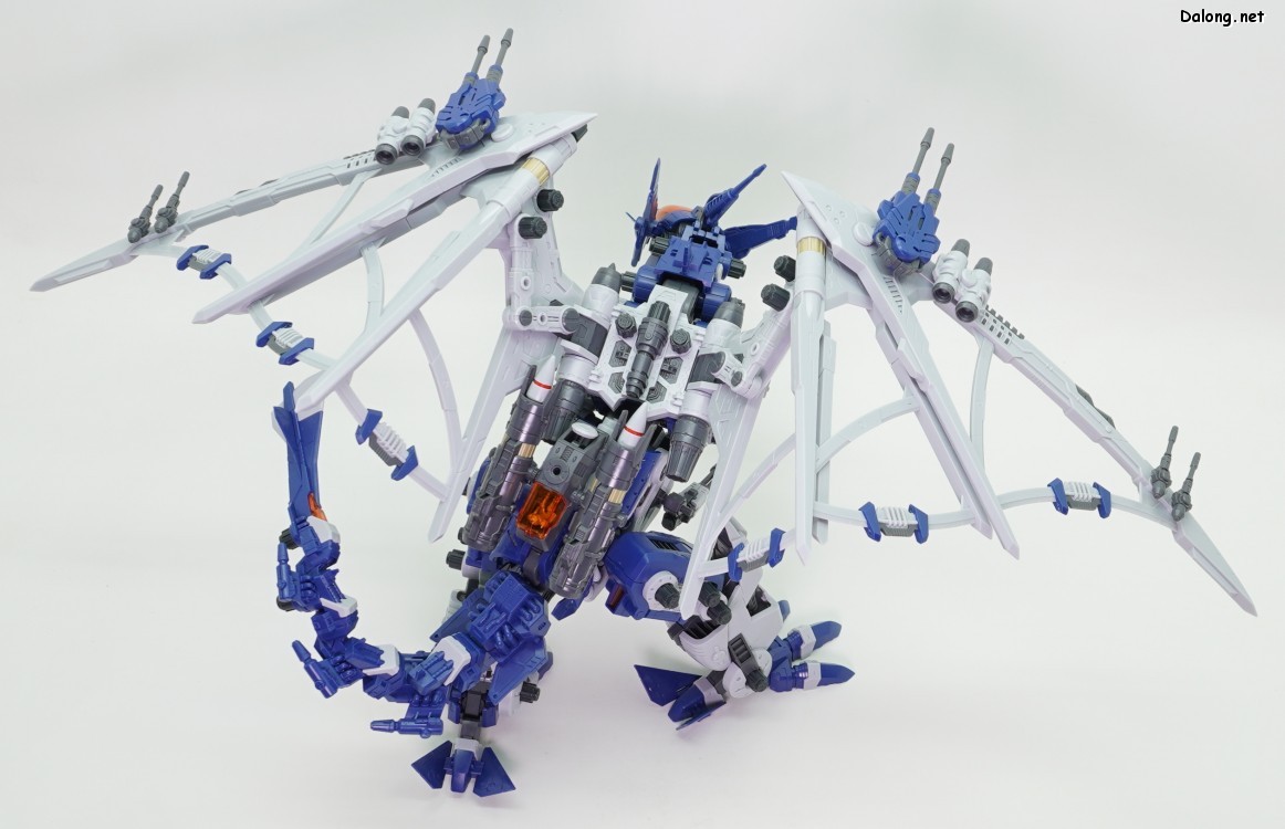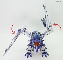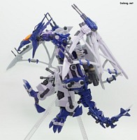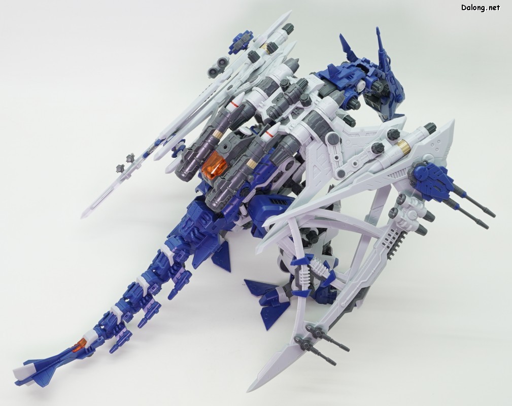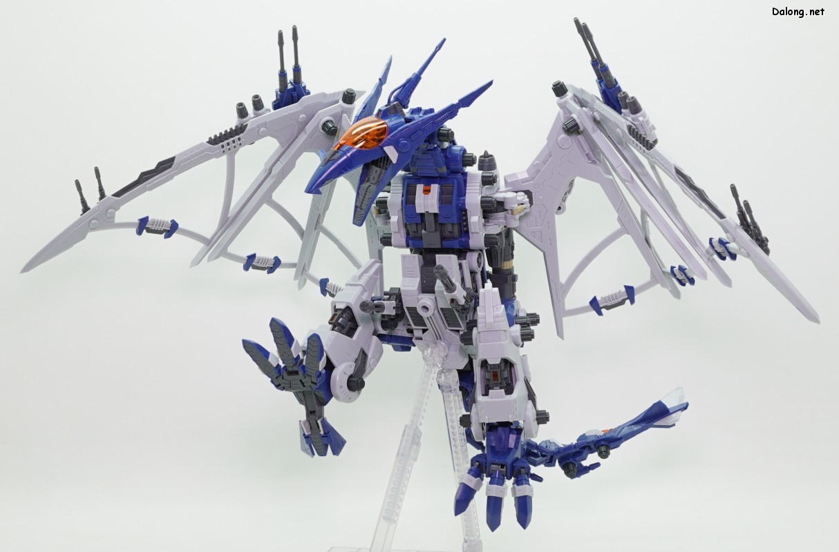 기믹적으로는 2개의 콕핏 해치 오픈 및 조이드 코어 분리가 가능한데요. 입을 벌리면 AZ 고열화염방사기를 노출시킬 수 있고, 등에 달린 2연장 전술미사일을 분리하여 별도 스탠드에 디스플레이할 수 있습니다. 스탠드에 올릴 때는 복부 커버 2개를 분리하여 스탠드용 복부 장갑으로 교체해야하는데요. 공중 디스플레이를 위해서는 별매의 플라잉 네오 베이스 2개가 필요한데, 반다이 액션베이스와는 고정핀 크기가 달라서 사용할 수 없습니다. 마지막으로 별매의 롱레인지 버스터 캐논을 장착할 수 있는 파츠 2개도 들어있긴 하네요.