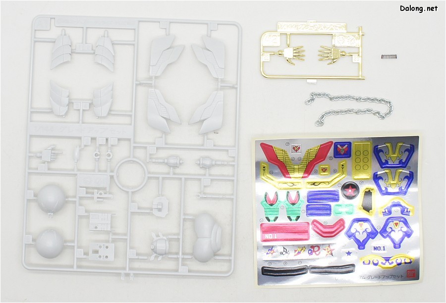 이렇듯 5가지 1/144 건담용으로 나름 유용한 악세사리들이 합본되어 있는데, 골드코팅에 메탈체인, 스프링 기믹까지 꽤 고급스러운 구성에도 불구하고 200엔이라는 놀라운 가격으로 나왔습니다. 아쉬운 점은 동봉된 스티커의 접착력이 유독 약해서 쉽게 떨어진다는 점이고, 이렇게 많은 스티커를 넣어주면서 샤이닝 건담의 얼굴 스티커를 빼먹은 점도 거시기하긴 하네요.