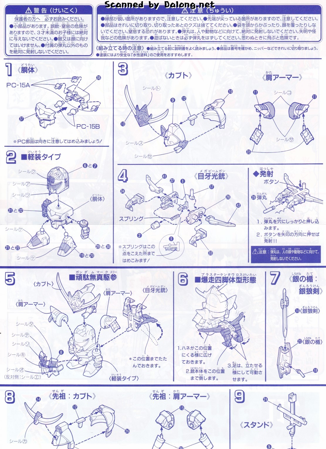 스프링으로 탄환을 발사하는 기믹으로는 메가빔건이 제공되며, 은랑도는 은의 방패 안쪽에 거치할 수 있는데요. 경장타입에 SD 버설 나이트 건담의 갑옷도 입힐 수 있게 되어 있습니다. 그리고 보너스 무장으로는 SD 무사 건세이버에 적용할 수 있는 승룡의 화살이 제공되네요.