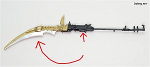 커다란 팬텀하켄에는 스프링 기믹이 들어있어서, 버튼을 누르면 칼날이 촥~하고 펴집니다. 또한 몸통 내부에는 용수철이 들어있어서, 허리를 회전시켰다가 놓으면 용수철의 탄력으로 휘리릭하고 제자리로 돌아오는데요. 이는 팬텀하켄을 휘두르는 포즈를 위한 기믹으로서, 팬텀하켄을 수평으로 잡고 허리를 돌렸다 놓으면 커다란 칼날이 휙~ 돌아가면서 공격하는 느낌을 살리고 있습니다.