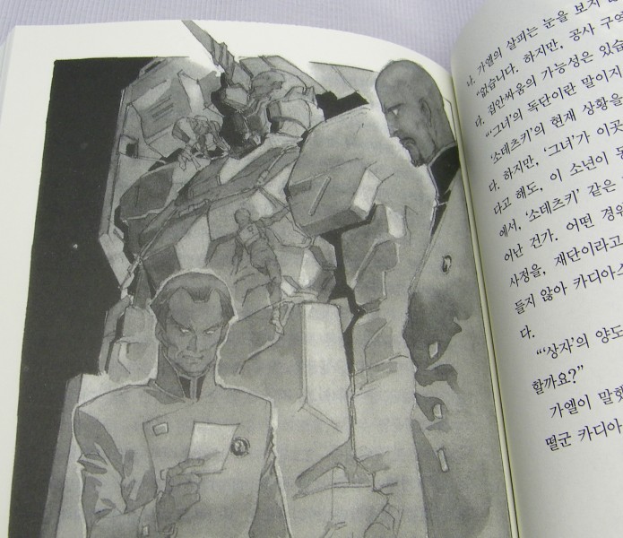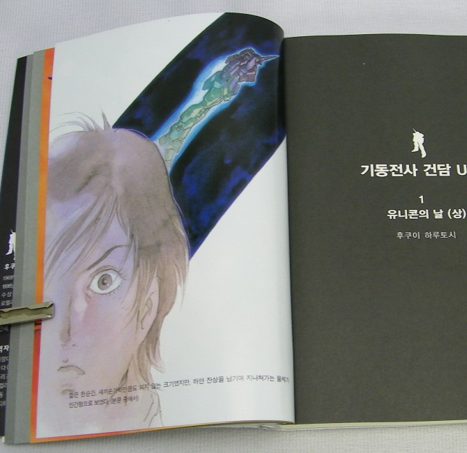 최근 OVA 의 시작으로 나름 붐을 타고 있는 기동전사 건담 UC 원작인 소설판이 AK 커뮤니케이션즈를 통해 한글화되었습니다. "망국의 이지스"로 유명한 작가 후쿠이 하루토시가 쓴 UC 원작은 사실 평이 그다지 좋은 소설은 아니었습니다. 특히 올드팬 입장에서는 뭔가 동의하기 어려운 극의 전개가 아닌가 싶은 의견도 많았지요. 그치만 혹평만 있던 것은 아니고, 참신하고 새로운 요소도 분명 포함하고 있습니다. 최근 OVA화된 유니콘 건담 애니는 소설보다 훨씬 더 인기를 끌었고, 덕분에 원작 소설도 다시 인기를 얻는 현상도 발생하고 있지요. 제가 막상 어느정도 내용을 읽어봤을 때는 사실 그렇게 혹평할 내용같아보이진 않았습니다. 이질적인 요소도 있긴 하지만 건담을 좋아하는 독자라면 나름 흥미롭게 읽을 수 있는 내용이라고 느껴졌지요. 이번에 한글화된 책은 일본원서와 전체적으로 비슷한 느낌인데, 오히려 종이질이나 인쇄질은 더 깔끔한 듯 합니다. 삽입된 삽화들은 애니를 본 분들에게는 익숙한 이미지들로서 구성되어 있어서, 애니를 본 분들에게 더 흥미를 끌 듯 하네요. 1권에 수록된 내용은 OVA 1화의 중후반부까지 수록된 내용인데, 역시 원작 소설답게 애니상에서는 충분히 설명되지 않았던 여러 요소들에 대해 좀더 자세히 알아보는 재미가 있습니다. 내용을 보시면 아시겠지만, OVA가 원작에 꽤 충실하게 전개되고 있어서 내용적으로는 거의 동일하다고 보셔도 됩니다. 다만 대부분 소설에 기반한 애니나 영화가 그렇듯이, 원작에는 정황 설명이 좀더 차분하게 잘 되어 있기 때문에 몰입하기가 더 쉬운 면이 있습니다. 책 두께는 대략 230여 페이지 정도로, 두께도 얇은 편이고 내용도 술술 읽혀지는 편이라 꽤 빠르게 독파할 수 있는 듯 하구요.. 어찌보면 말많은 UC 원작 소설을 제대로 한글화했다는