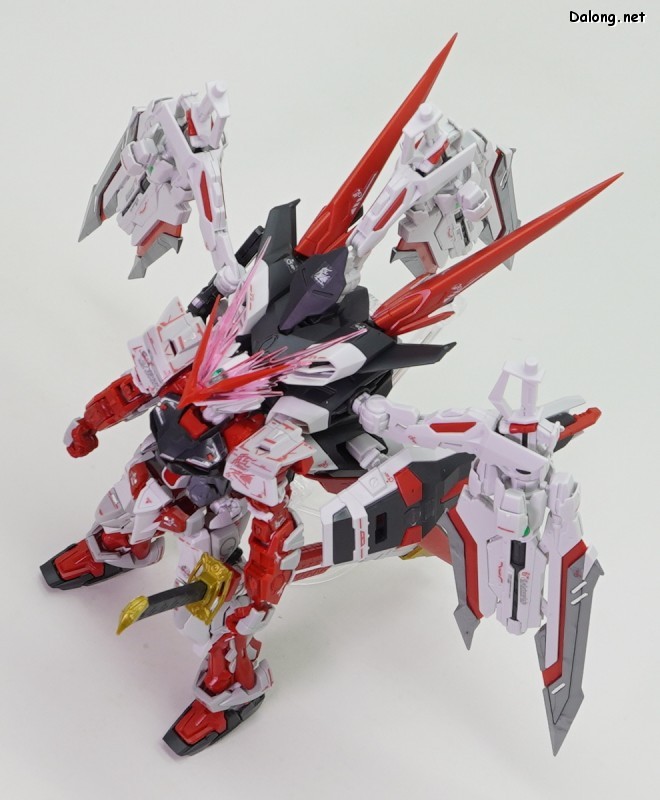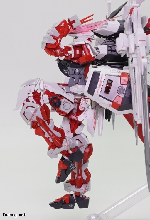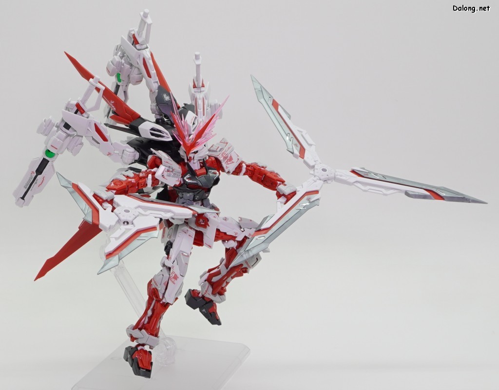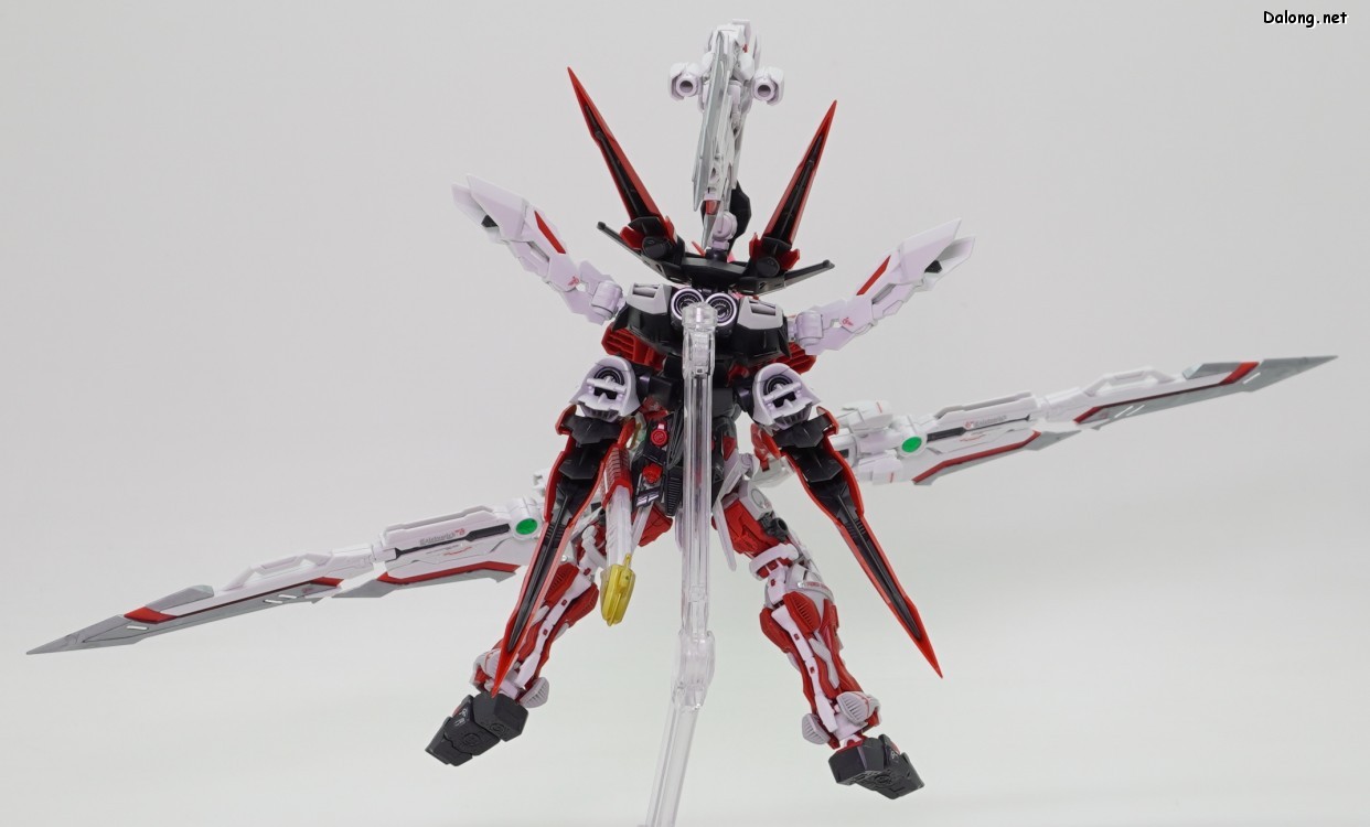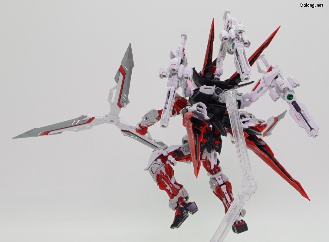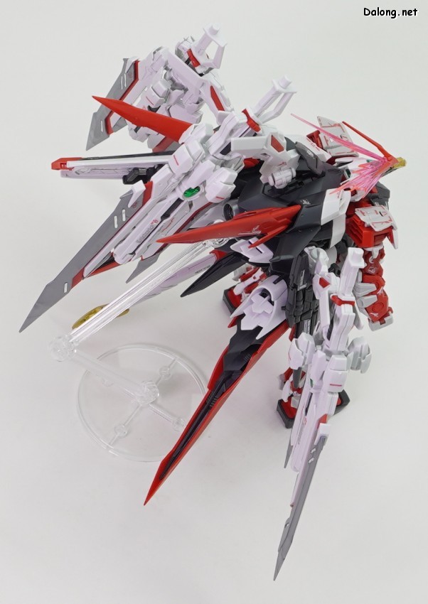 그리고 본체의 관절강도는 충분히 튼튼해서 포즈의 고정성이 뛰어나지만, 백팩이 너무 크고 무거워서 스탠드 없이는 자세 유지가 불가능한데요. 이건 MG는 물론, 건담베이스 한정판으로 나온 HG 건담 아스트레이 레드 드래곤도 동일합니다. 그래서 MG와 HG 모두 스탠드가 기본 포함이었고, 이 킷 역시 2개의 소형 클리어 스탠드가 동봉되어 있긴 한데요... 칼레드 불프 고정용으로는 충분하지만, 본체를 버티기엔 허약한 내구성을 보여주고 있습니다.