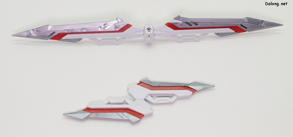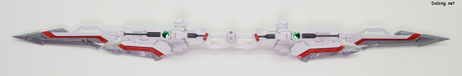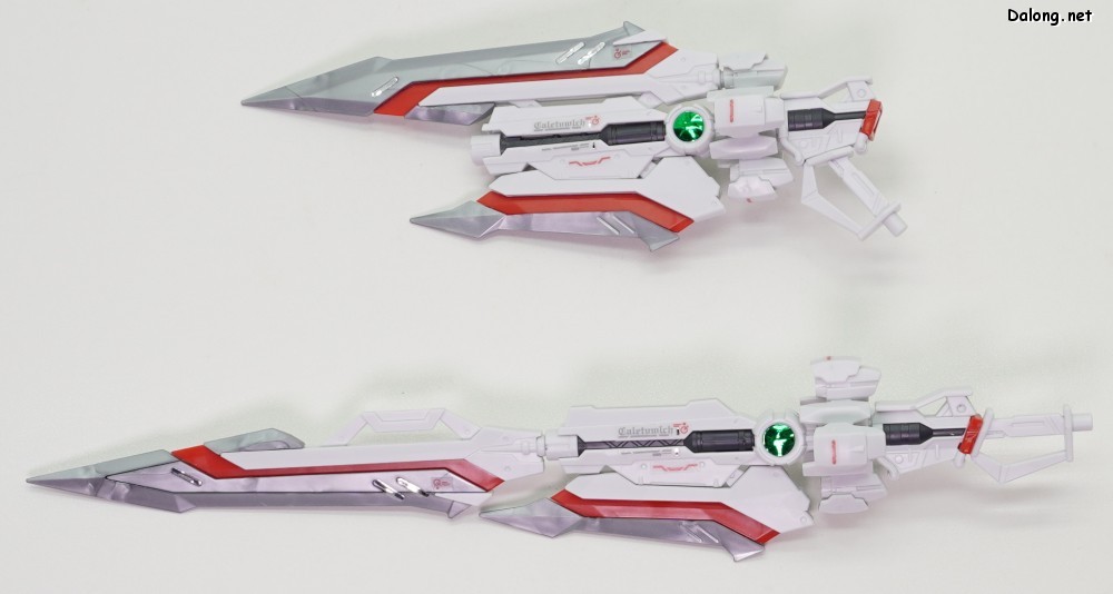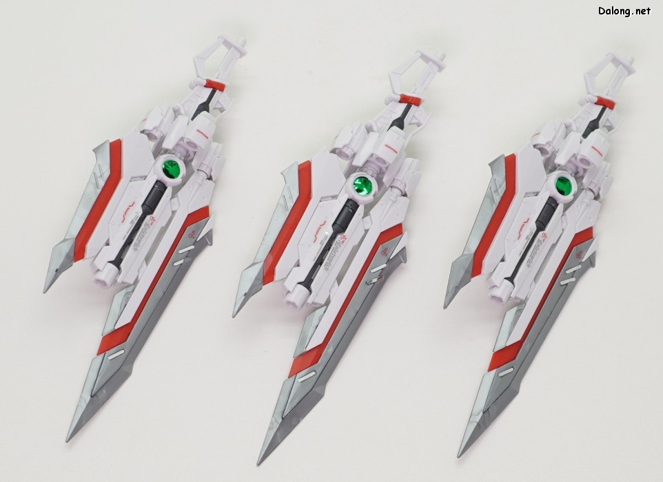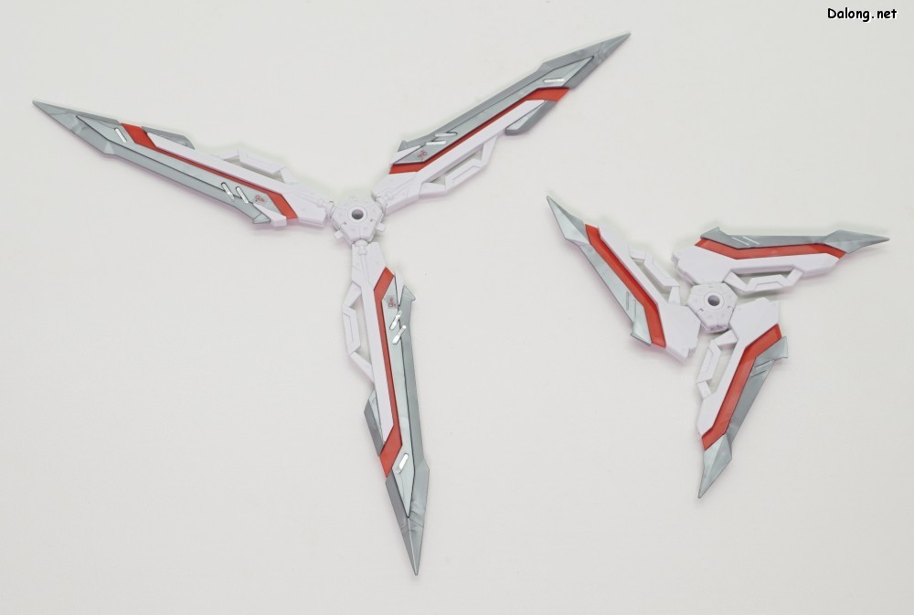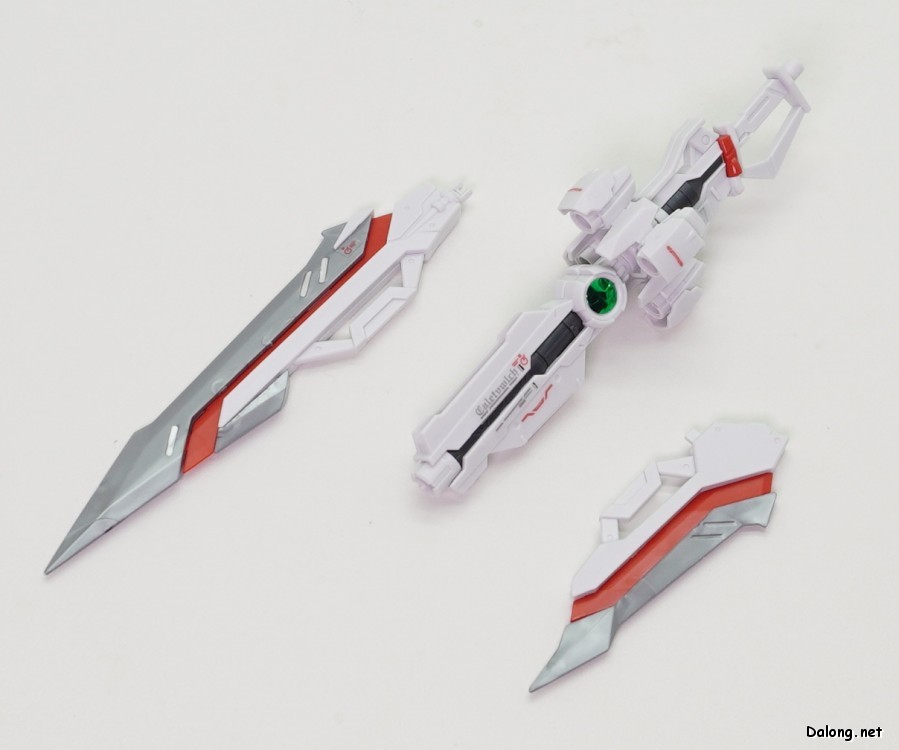 칼레드불프를 분리하여 다양하게 조합하는 것 역시 MG와 동등한 수준으로 구현되었는데요. 기본적인 S모드/G모드와 더불어 나이프/더블 커터, 암비덱스트러스 할버드로 조합할 수 있습니다. 여기에 RG만의 오리지널 기믹으로, 2가지 크기의 칼날을 각각 3개씩 표창처럼 맞물리게 조합할 수 있게 해주었는데요. 칼레드불프용 전용 손도 함께 제공되고 있어서, 악력 문제 없이 튼튼하게 고정할 수 있습니다.