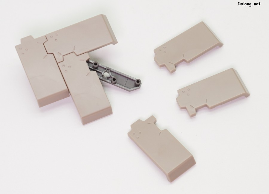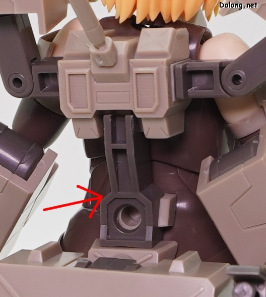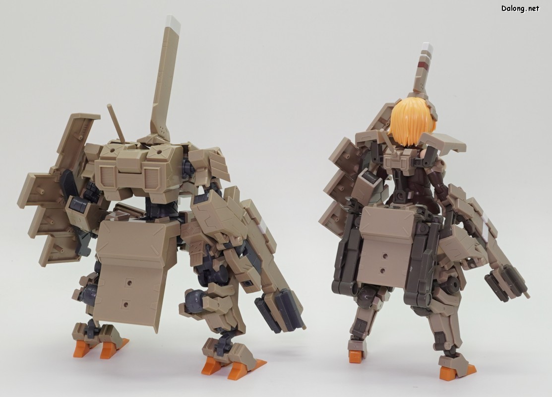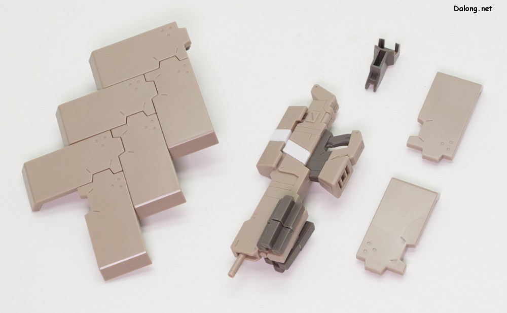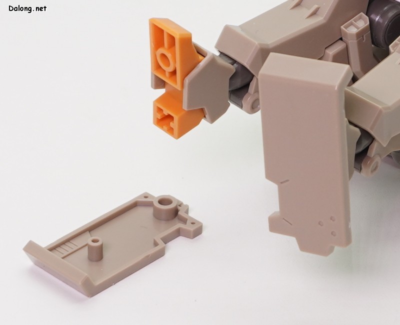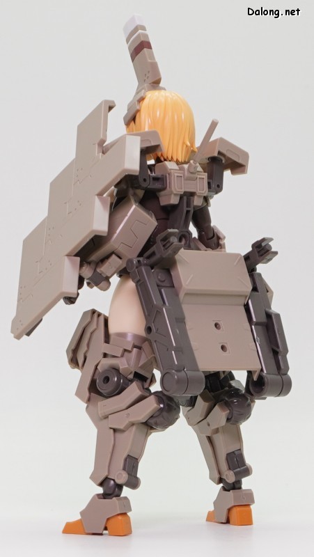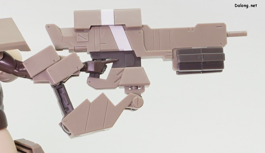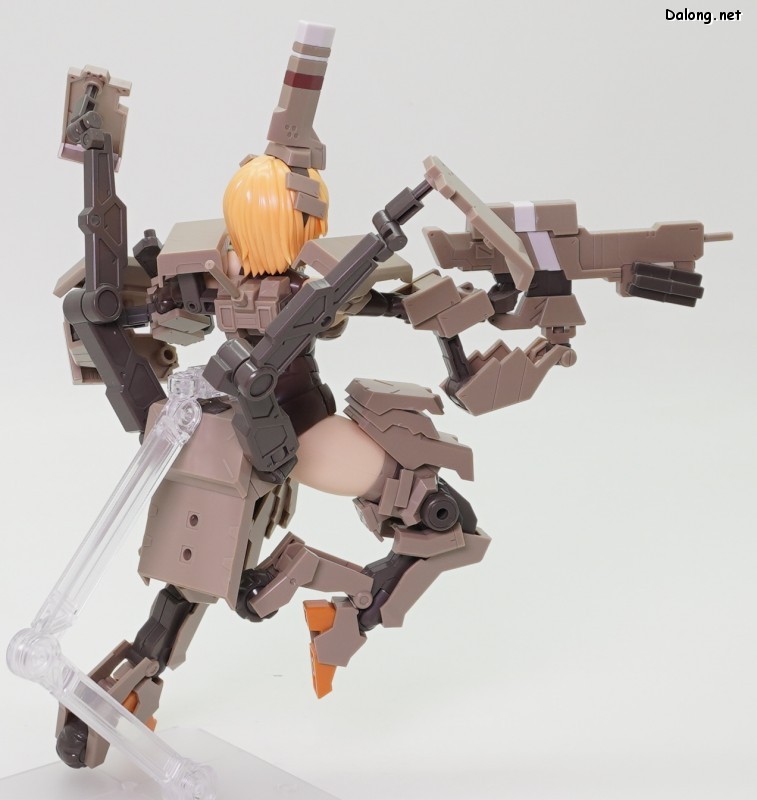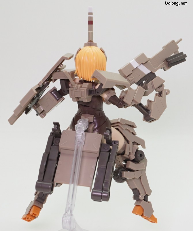 무장으로는 라이플과 대형 실드가 제공되며, 대형 실드에 달린 소형 실드는 하나씩 분리할 수 있는데요. 소형실드는 발바닥이나 서브암에 장착할 수 있으며, 이를 위해 팔뚝과 리어 스커트에 대형 다관절 서브암이 장착되어 있습니다. 이러한 서브암들은 라이플을 고정하는 용도로도 사용할 수 있는데요. 팔과 뒤쪽 서브암 모두 관절강도가 우수해서, 고정성과 관련된 스트레스는 전혀 없습니다. 그 외에 등에 보조파츠를 추가하여 허리를 일자로 고정할 수 있는데요. 무거운 병장들에도 불구하고 똑바로 자세를 잡는데 도움이 되긴 하지만, 고정성이 약해서 잘 떨어지는 문제가 있습니다.