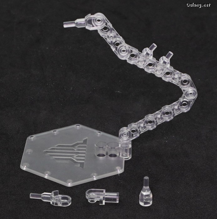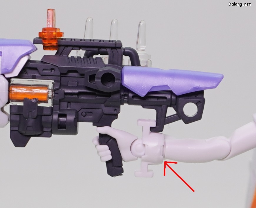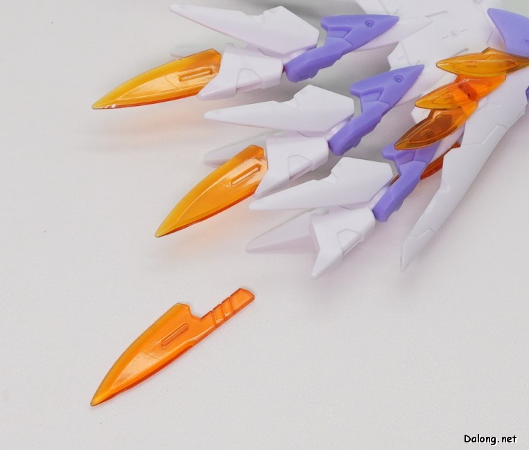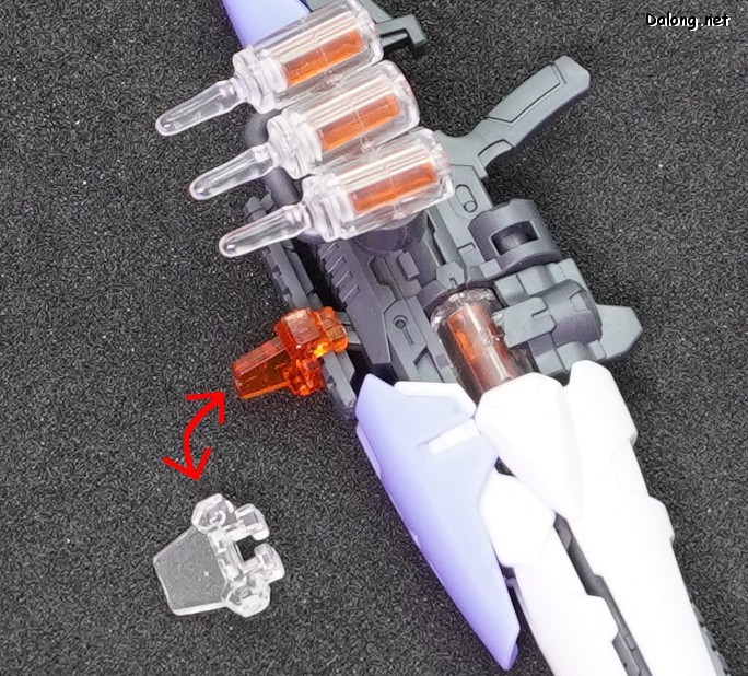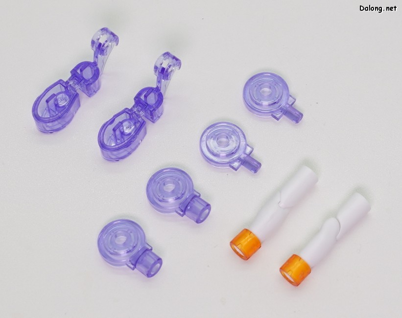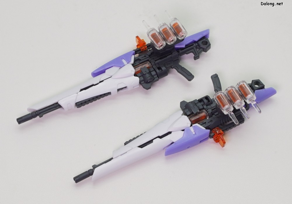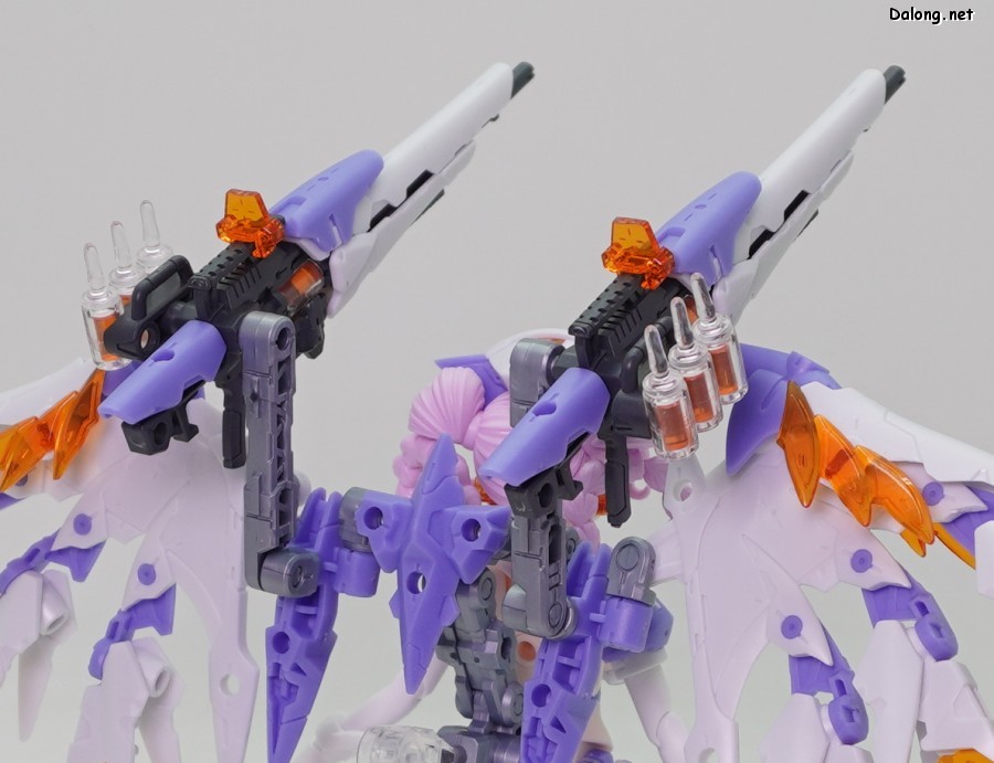 무장으로는 독특한 디자인의 라이플 2기가 제공되는데요. 조인트 파츠를 이용하여 손목과 단단히 결합하거나, 날개에 장착할 수 있습니다. 라이플의 탄창처럼 사용되는 앰플의 경우는, 2가지 색상의 클리어 파츠를 잘라넣어 내부의 액체를 표현하고 있는데요. 상당히 독특한 조형 방식으로서, 투명한 병에 담긴 듯한 효과는 꽤 괜찮은 듯 합니다.