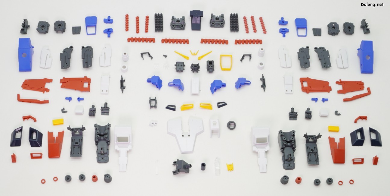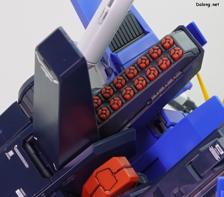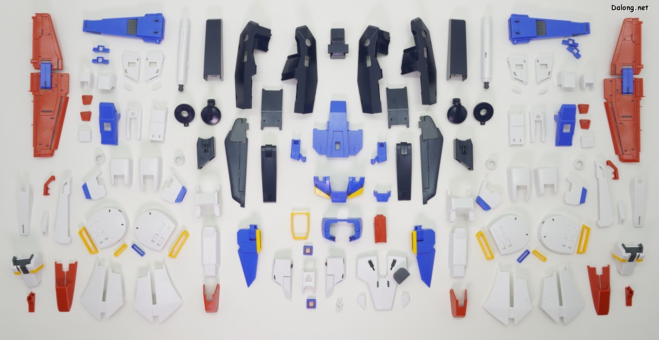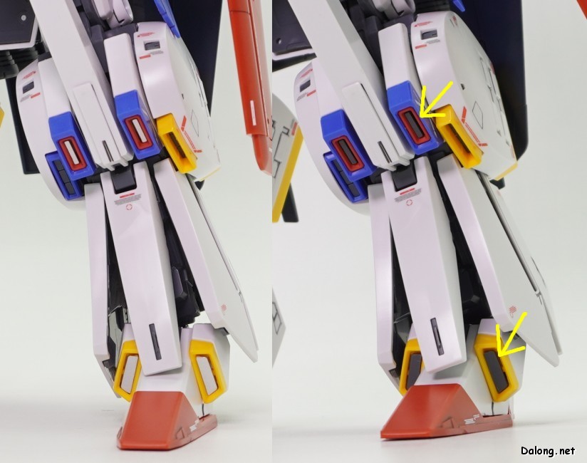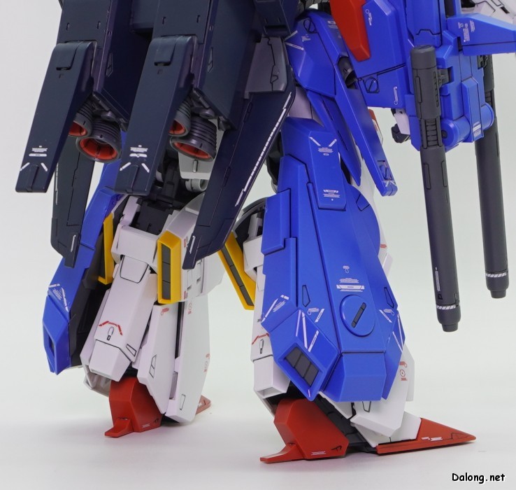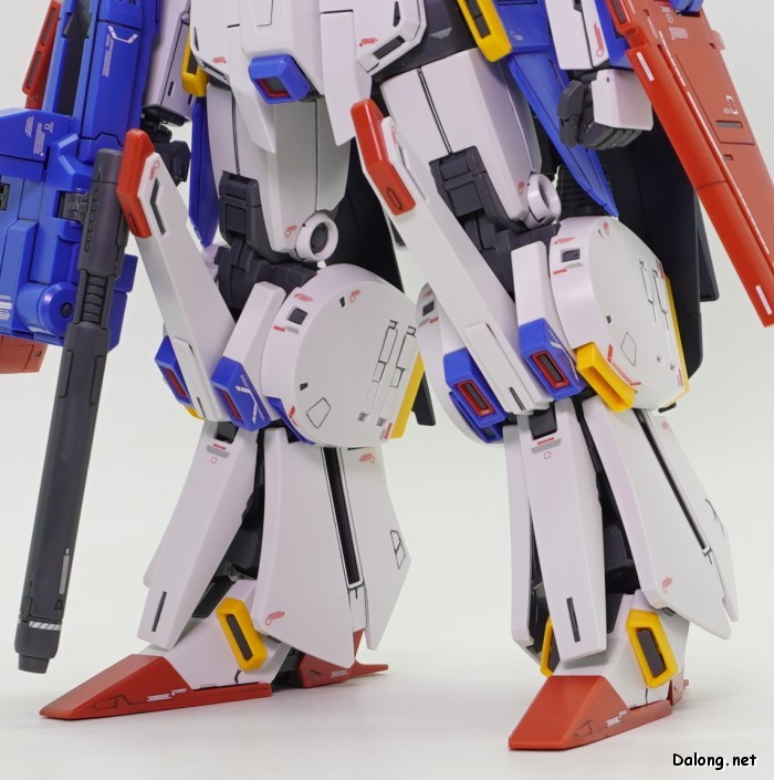한가지 아쉬운 점은 색분할인데요. MG ZZ건담 Ver.Ka에서 은색 코팅파츠로 포인트 컬러 역할을 쏠쏠히 하던 부위들이 회색으로 바뀌면서, 살짝 더 밋밋해졌습니다. 또한 버니어 컬러가 구분되지 않던 무채색 FAZZ의 파츠를 그대로 재활용하다보니, 어깨와 다리의 버니어들이 전혀 색분할이 안되어 있습니다. 본체는 버니어 내부를 색분할로 고급지게 처리해주었는데, 막상 색분할도 안된 풀아머 장갑으로 가려버리는 아이러니가 생겨버렸네요. 특히 다리의 휑한 버니어는 이게 10000엔이 넘는 고가의 MG 킷인가 하는 아쉬움이 진하게 남습니다.