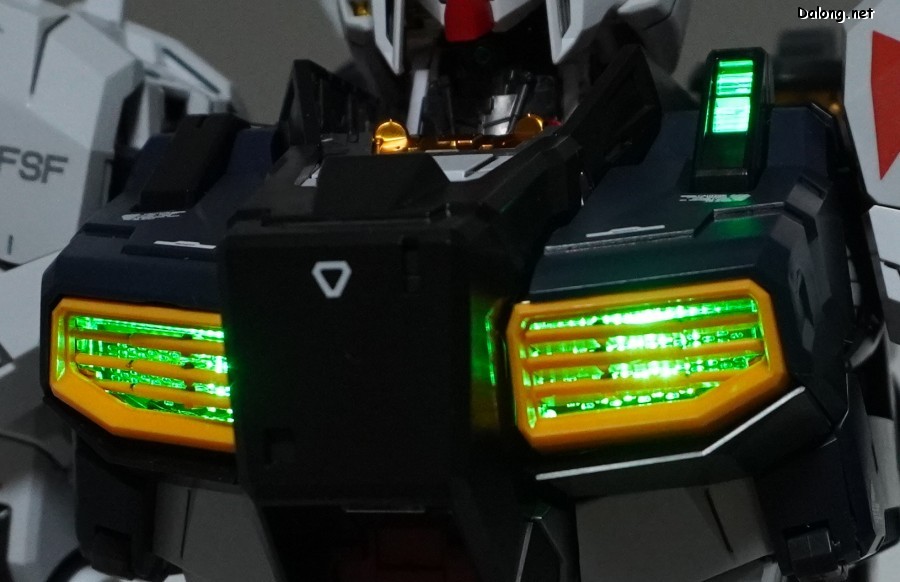 또한 전신에 걸쳐 영롱한 광채를 내뿜던 PG 유니콘 건담과 달리, 이 LED 유닛은 오직 상체 프레임 내부에만 배치되네요. 위 사진에서처럼 머리와 가슴의 카메라/눈/덕트, 그리고 콕핏에만 점등됩니다. 버튼을 한번 누르면 머리와 가슴에만, 한번 더 누르면 덕트와 콕핏까지 불이 들어오는 2단계 점등인데요. 발광의 효과 자체는 밝고 선명해서, 적당히 괜찮은 수준입니다.